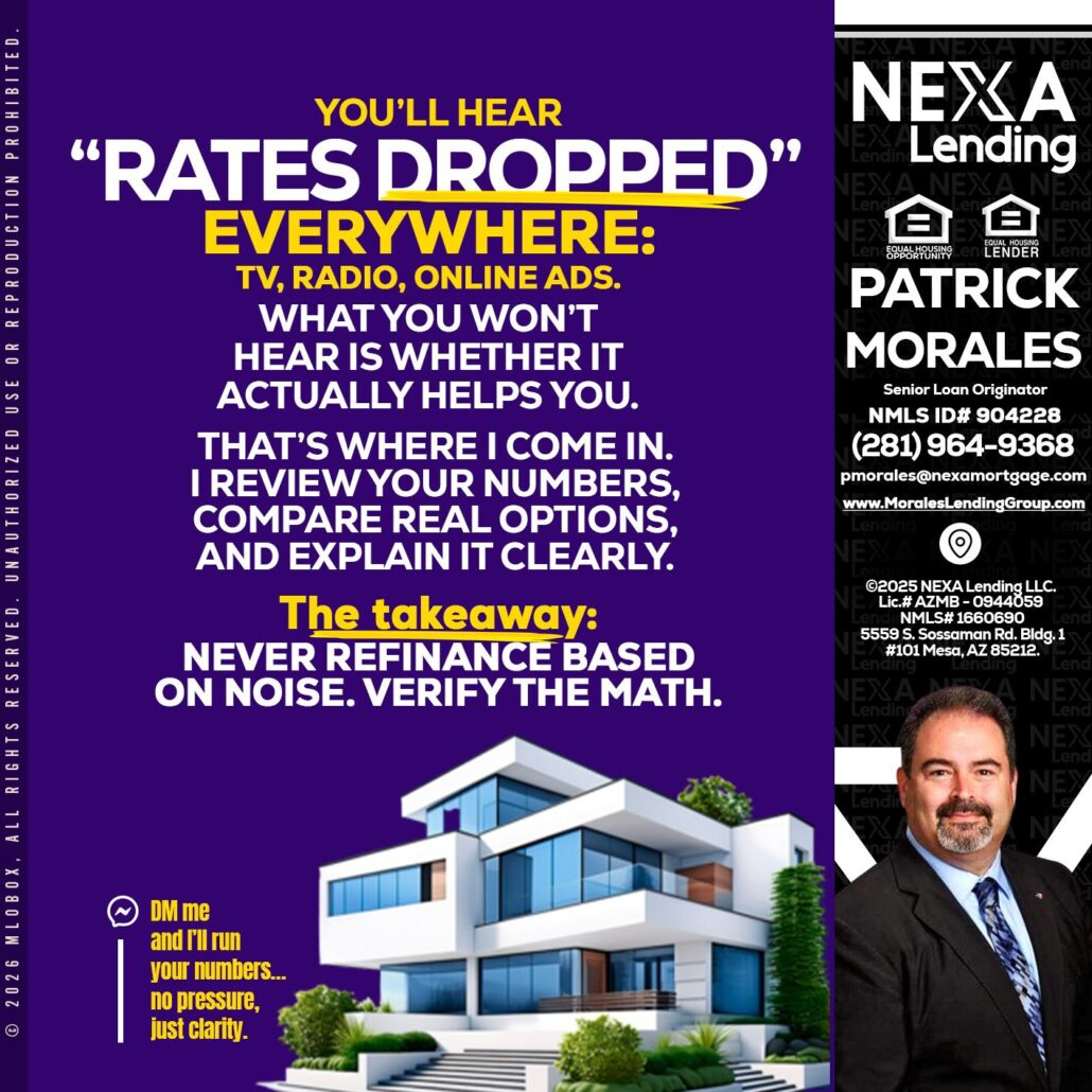 Hi, my name is Patrick Morales. I’m a Loan Officer with NEXA Lending LLC, offering personalized mortgage solutions, fast customized quotes, great rates and service with integrity.
